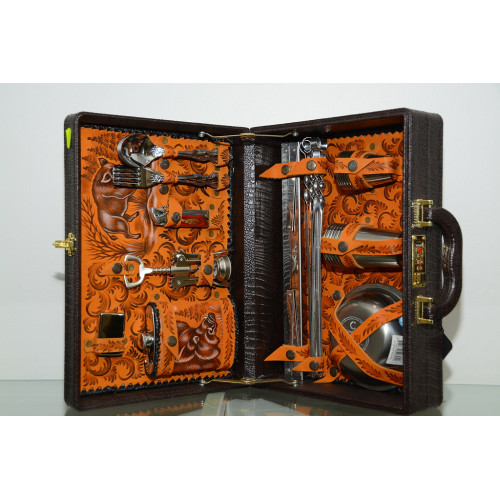 Набор Турист (кожа) — комплект из натуральной кожи для походного питания и приготовления пищи на природе. Включает все необходимые столовые приборы и аксессуары, защищённые в компактном футляре для удобной транспортировки.