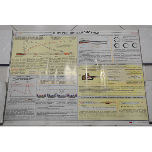 Плакат «Внутренняя баллистика» отражает процессы, происходящие в оружии при выстреле. Представлены схемы, формулы и пояснения для учебных целей.