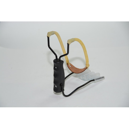 Рогатка МВ (большая, с упором) — прочная метательная рогатка большого размера с упором для запястья, обеспечивающим стабильность при прицеливании и натяжении жгута. Корпус сочетает металлический каркас и эргономичную пластиковую рукоятку; седло для снаряда выполнено из прочного материала (кожа/усиленный резиновый вкладыш).